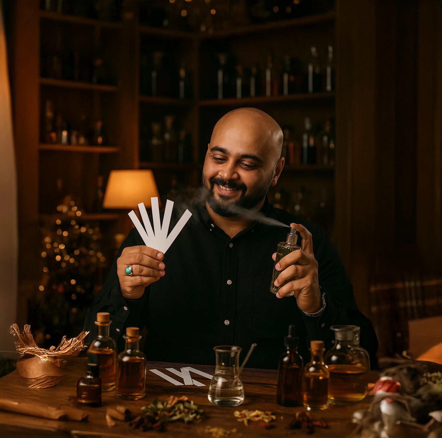 Ambassador Scentworks Co. is led by our founder, Safeer, whose journey blends science, passion, and craftsmanship. After completing his Master’s in Industrial Engineering from IIT Kharagpur and building a strong career in manufacturing, his love for perfumery guided him to the Grasse Institute of Perfumery in France.
