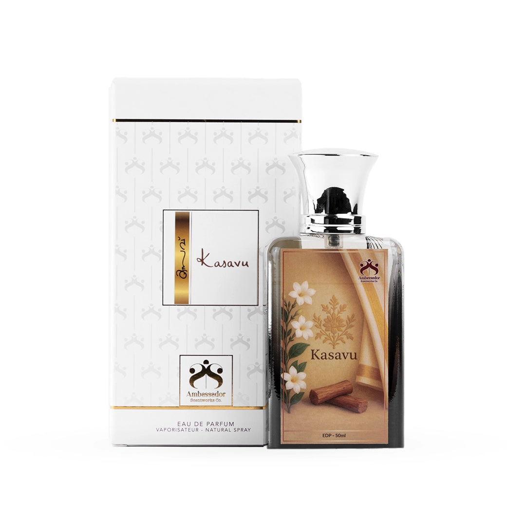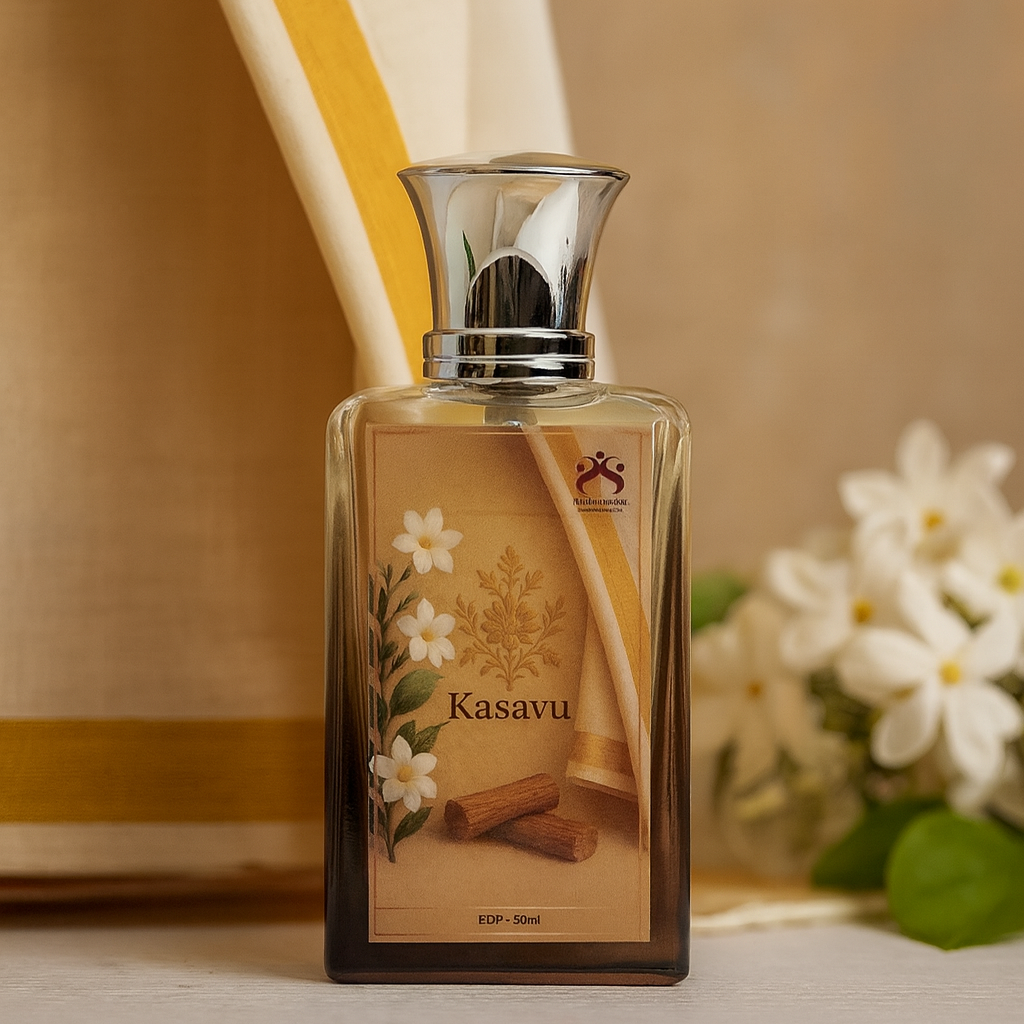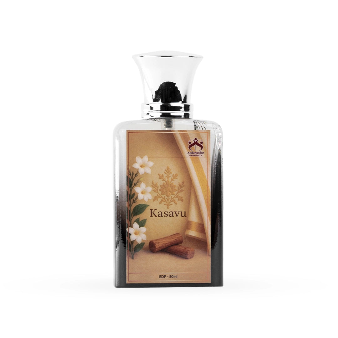 Kasavu is a tribute to that quiet elegance — not loud, but deeply rooted in cultural pride. Its floral heart blooms like delicate white flowers offered at temple steps, while warm sandalwood and soft musks settle like a sacred calm upon the skin.