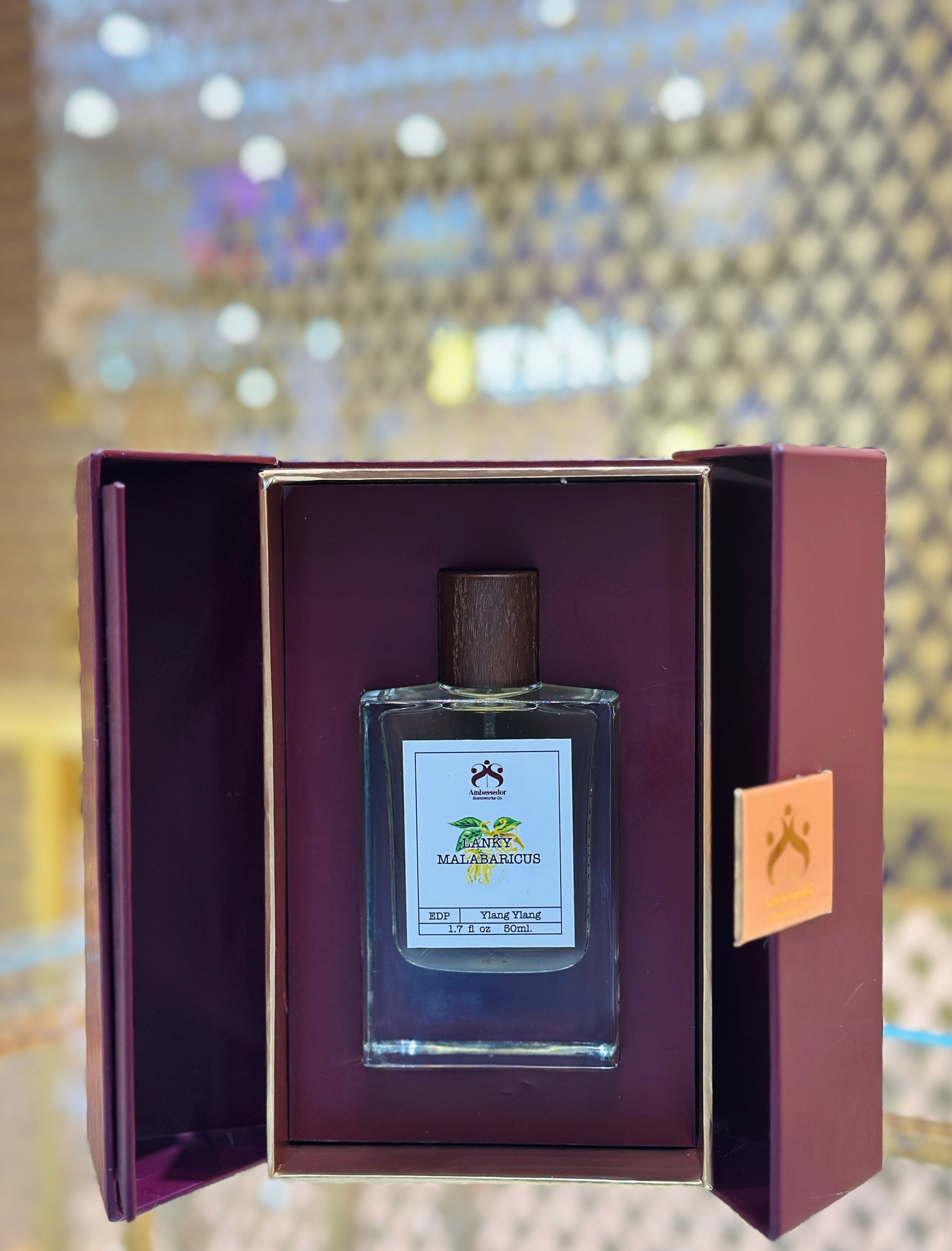 Lanky Malabaricus is a bold floral composition rooted in the tropical soul of Kerala. With dual ylang ylang oils at its core, softened by Damask rose and jasmine, and finished with warm sandalwood and saffron, it’s a celebration of botanical elegance. Wild, poised, and rooted in tradition — this is the scent of the modern South.