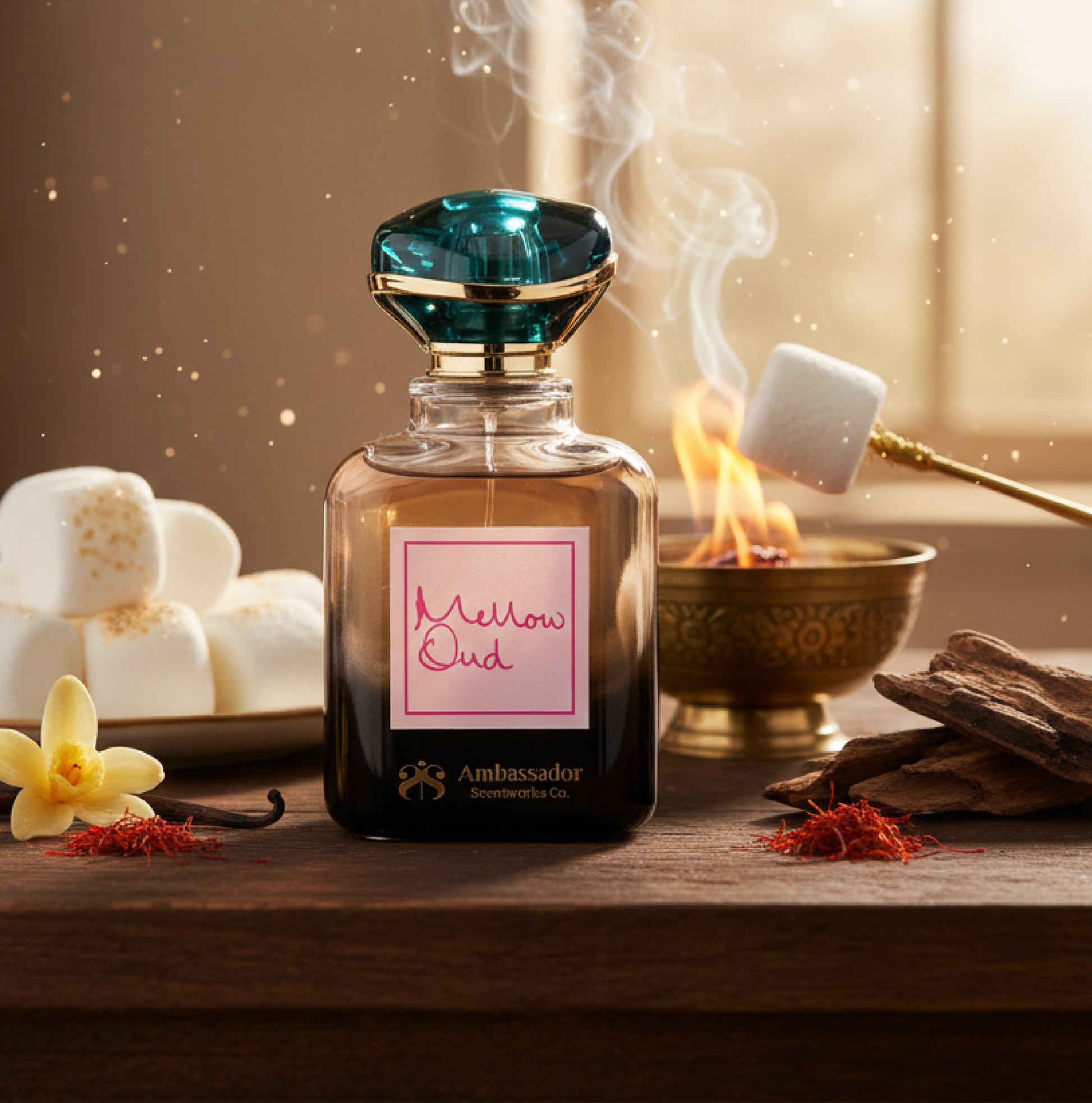 Mellow Oud opens like a comforting embrace — fluffy marshmallow clouds sweetening the air with instant delight. As it melts into creamy vanilla, warmth surrounds the senses like a familiar hug in a calm evening.