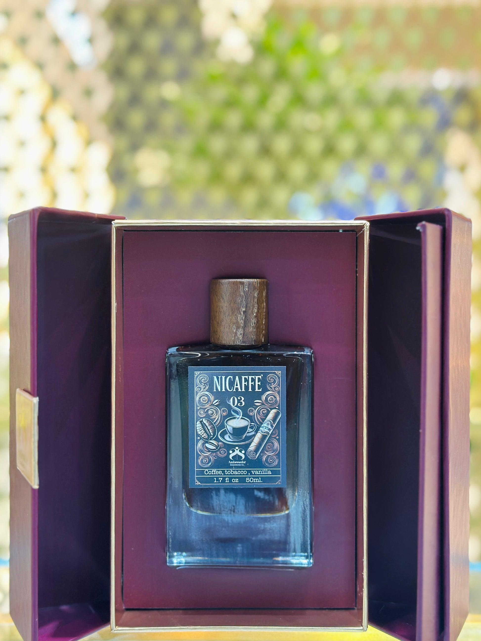 NICAFFE 03 is a fragrance for thinkers, dreamers, and those who savor the quiet power of presence. With robust coffee opening notes, a smoky heart of tobacco, and a smooth vanilla base, it captures the soul of still moments and meaningful musings. A perfect balance between bold and gentle — it is refined, nostalgic, and effortlessly charismatic.