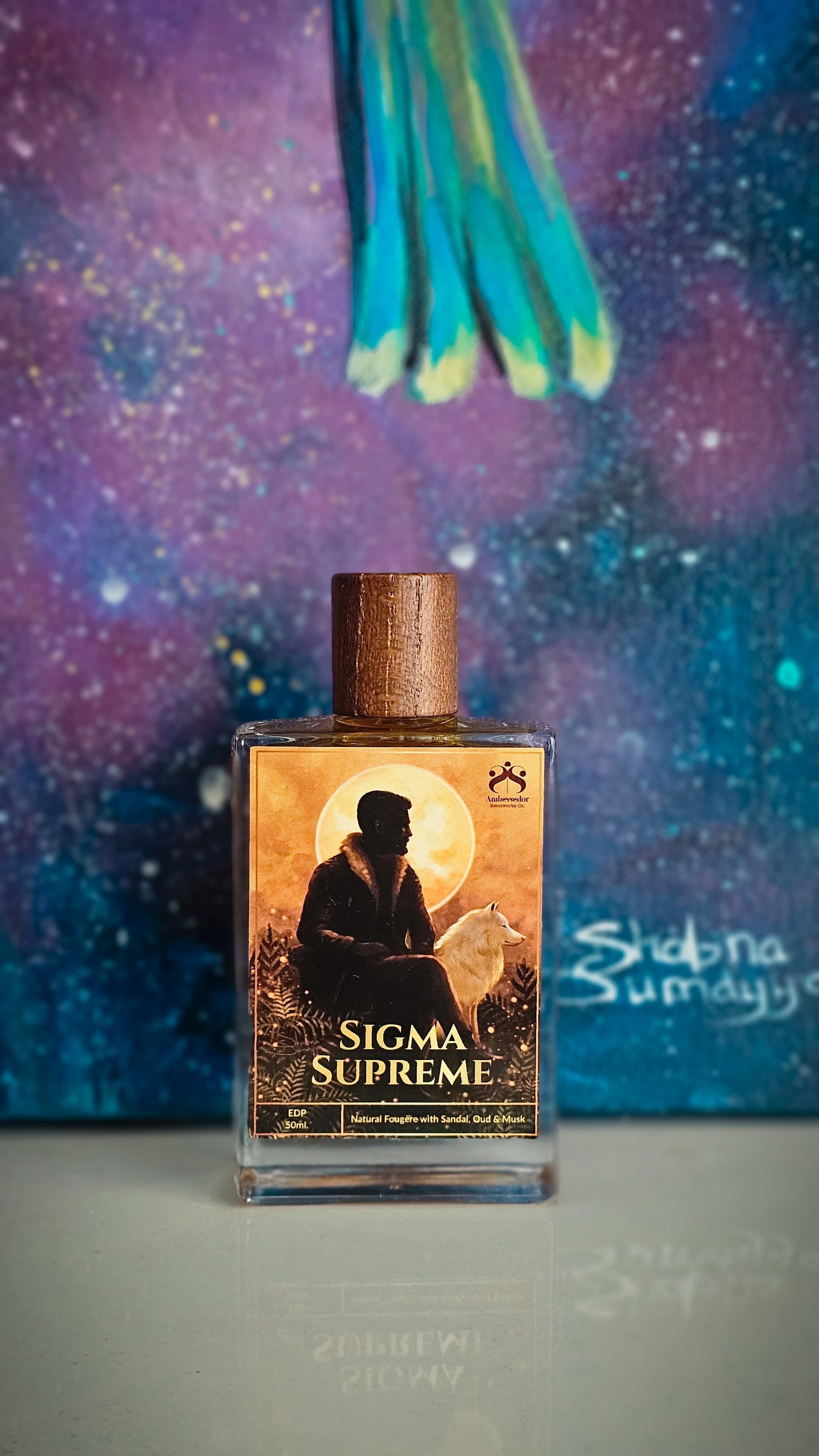 Sigma Supreme unfolds like the sigma male’s persona — calm at first, then deeply compelling. Bright citrus and aromatic herbs give way to layered woods and florals, revealing a touch of animalic mystery through natural musk. The fragrance settles into a rare blend of oud, Mysore sandalwood, and vetiver — grounding, silent, yet unforgettable.